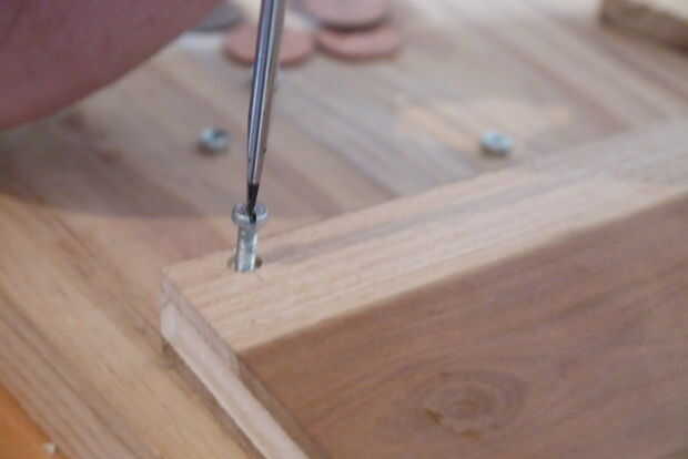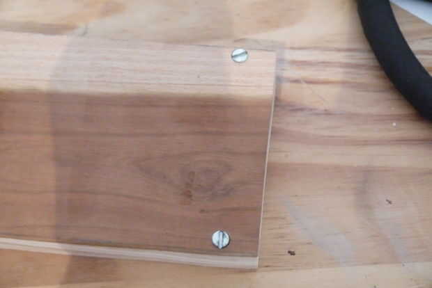 Ampliar luego muy superficialmente los agujeros en la tapa con una broca del tamaño de la cabeza del tornillo para que no se peguen hacia fuera. Tenga cuidado de no ir todo el camino a través de la tapa o no encendida.