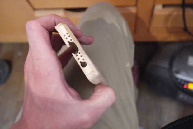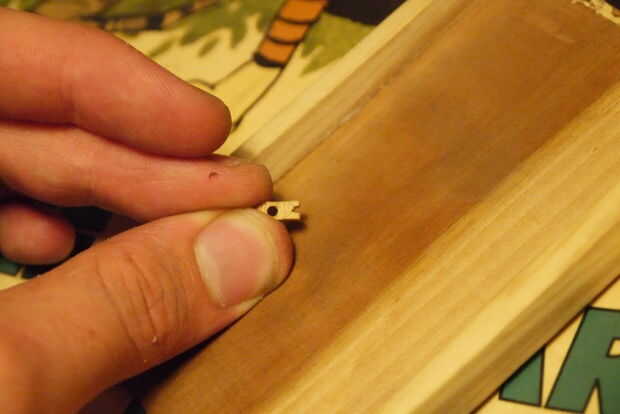 El interruptor silenciador era un poco más complicado: necesitaba una palanca por lo que diseñado un muy pequeño pedazo de desecho de madera (ver fotos) (tamaño aprox. de un partido) en un pequeño "palanca" con una muesca (desplazamiento aserrado) para coger el interruptor. hacer una muesca profunda y un agujero, luego arena fina para afinar la muesca a la medida. Es complicado.