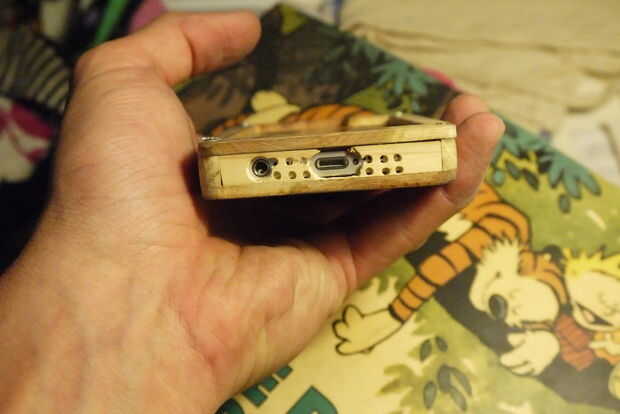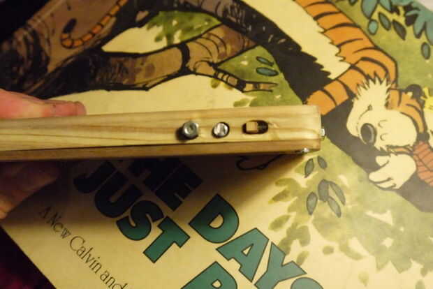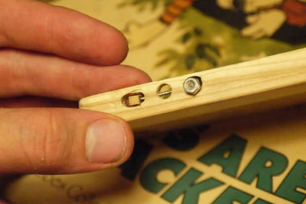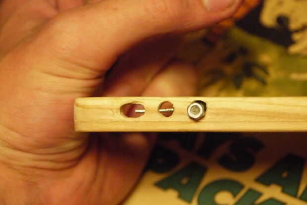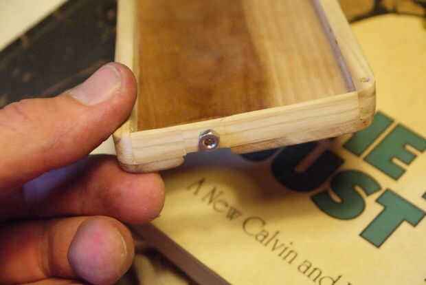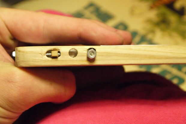 Los botones de (3 de ellos) son bastante simples: presentada una cabeza de tornillo plano, luego corte el hilo al tamaño con un disco de corte dremel (también puede utilizar una sierra de mano metálica fácilmente) y una tuerca con un poquito de pegamento para lo! (Sin tuerca en el (+) causa de botón de volumen que quería cambiar un poco el aspecto.) Antes de supergluing, asegúrese de que el teléfono pasa allí con los botones en. Que tendrás que lijar un poco de madera en el interior donde los botones son para que no sobresalga la cabeza y presionar botones del teléfono todo el tiempo.
