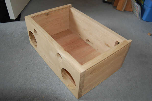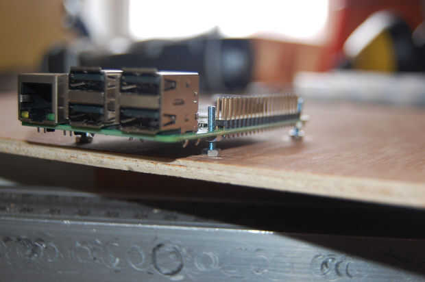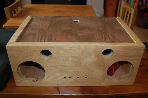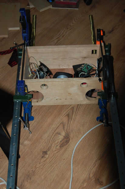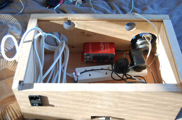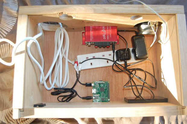 Yo entonces seco mi caja para asegurarse de que es ir todos a trabajar OK y antes de ponerlo a establecido donde necesitaba para perforar los agujeros para la frambuesa pi. También he añadido un par de trocitos de madera para subir el amplificador al nivel correcto y que podría fijarlo con tornillos.