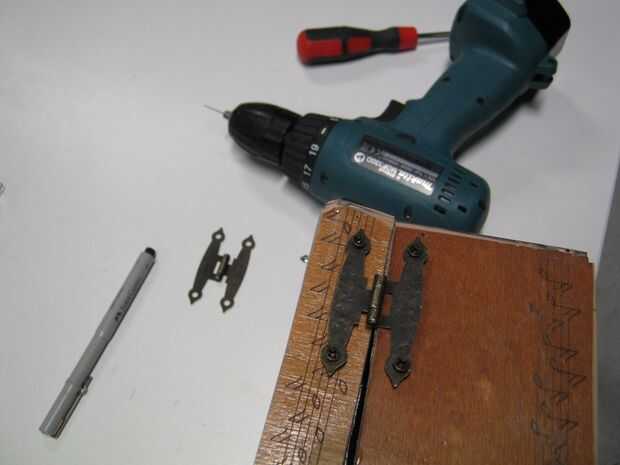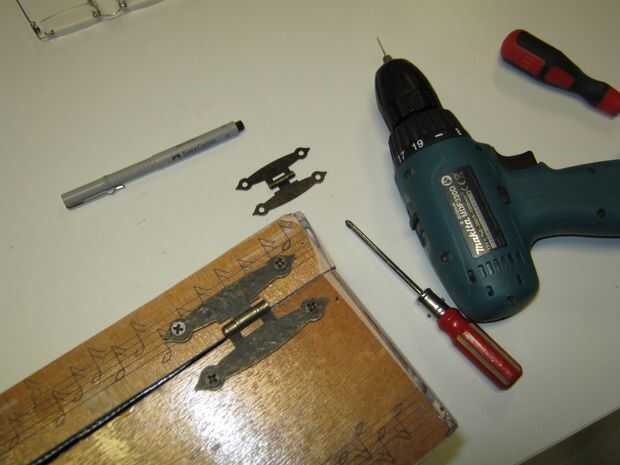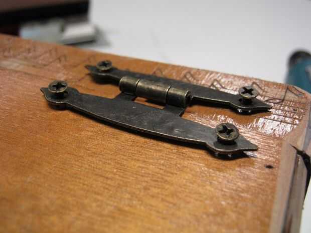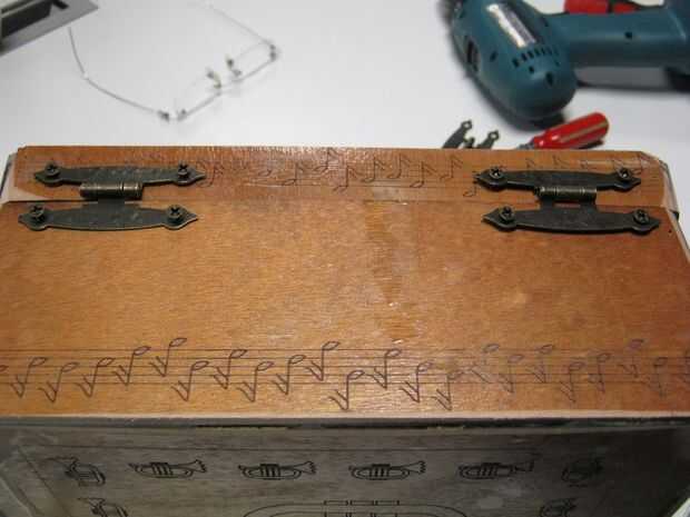 He puesto la tapa y el cuerpo de la caja encima de la otra y colocar la bisagra en el lugar necesario para comprobar si la tapa se abre bien a mano. Luego marcar los puntos a perforar por un lápiz. Les perforado con una broca de sólo lo suficientemente gruesa como para abrir los agujeros un poco apretados de los tornillos de m2 que he previsto. He elegido latón buscando tornillos para caber el estilo de steampunky.