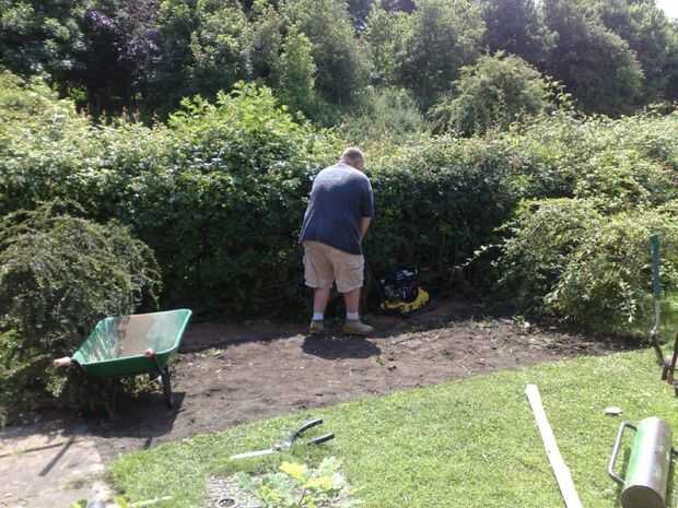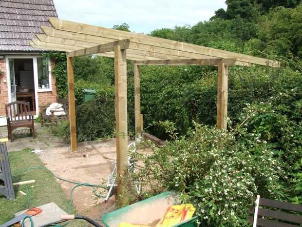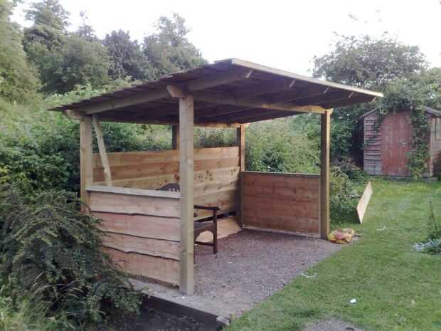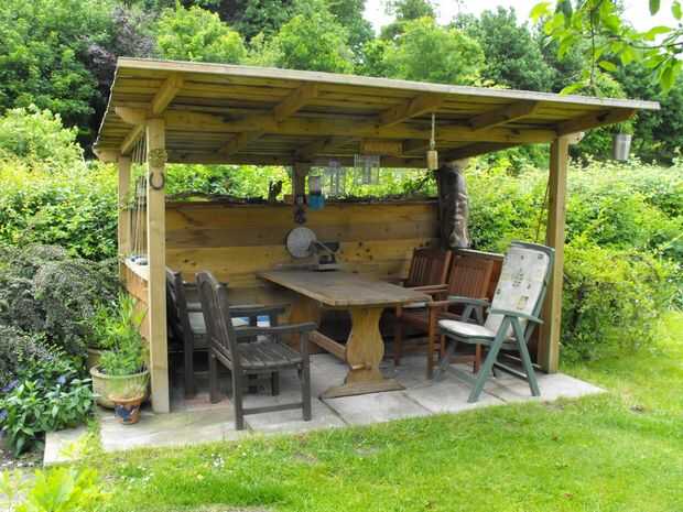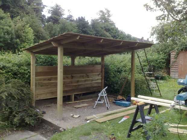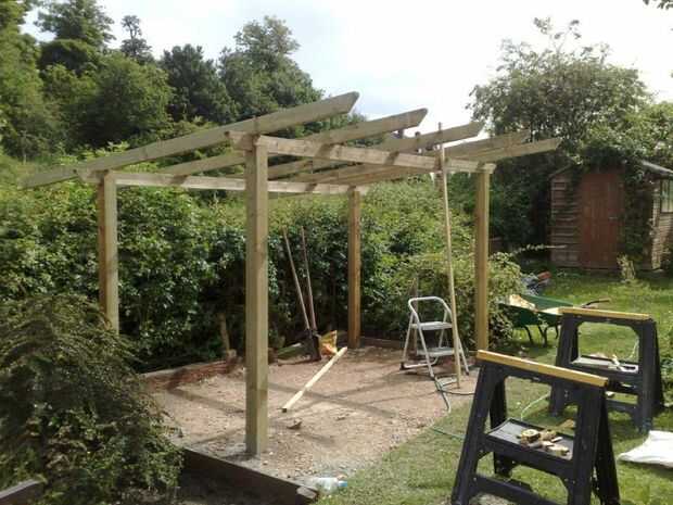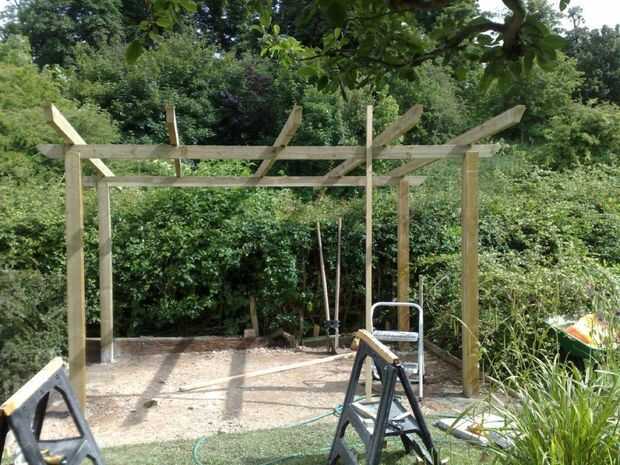 Foto 6 muestra la estructura básica va para arriba - quería un marco de estilo gazebo, que luego sería revestido. Apoyándose en el seto, verá el 'cucharas' que utilizamos para sacar piedra y tierra hacia fuera para hacer agujeros para los postes. Los agujeros fueron llenados con un hormigón de agujero posterior de secado rápido que establece bastante firme en pocos minutos, luego va completamente sólido en un par de horas.