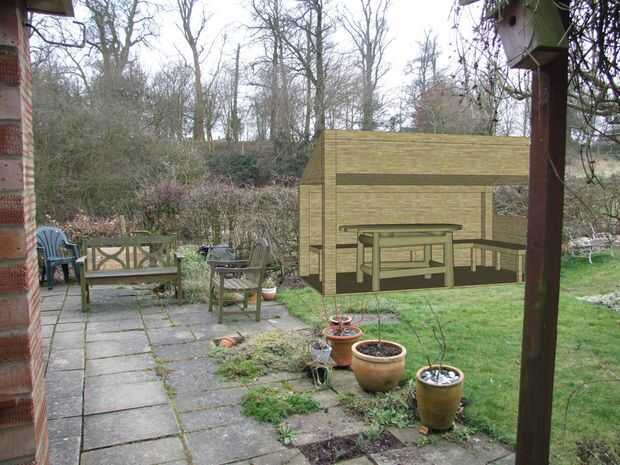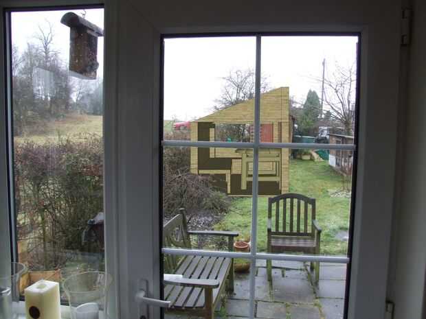 Lo primero que necesitaba era algún tipo de diseño. Utiliza Sketchup para hacer el doodle en imagen 1 y luego se dejó caer la estructura de 'prácticamente' en mi jardín con Photoshop. Quería mostrar a mi esposa lo que el edificio tendría el aspecto cuando totalmente construido y para mostrar que no sería demasiado de una monstruosidad en la búsqueda de nuestra cocina (Fig. 3)