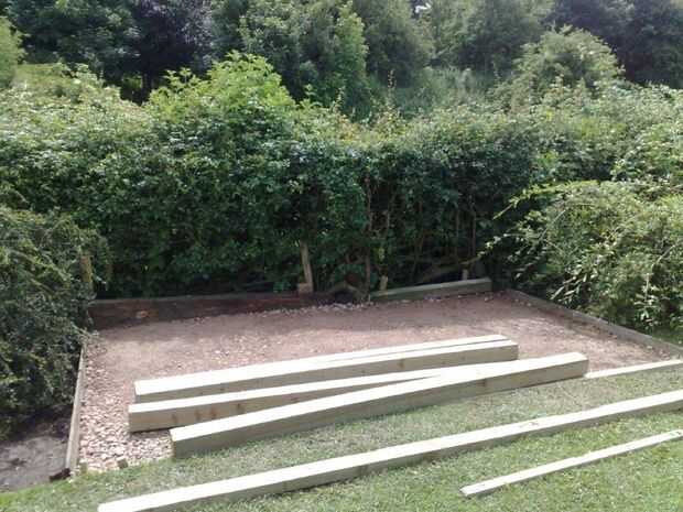 Sí, que es pequeño de edad me, (foto 4) usando un whacker placa de gasolina para comprimir el suelo. Mi amigo Simon y yo habíamos recortar el césped y sacar unos 9" del suelo para llegar a la deseada 'huella'. El suelo en nuestra zona es arcilla pesada, así que decidimos que no necesitamos ningún zapatas mayor que esto y el lastre.