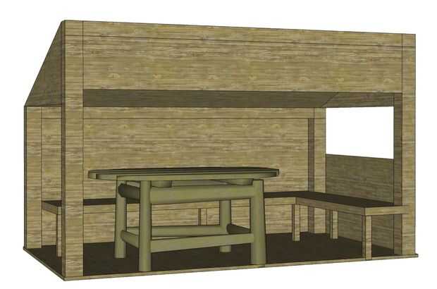 Cuadro 9 muestra la estructura completa. Las mayores diferencias entre la idea original y el producto final están que decidimos que necesitábamos medio-paredes en ambos extremos para resguardarse del viento, y también decidimos no construir bancos dentro de la estructura, prefiriendo libre de mesas y sillas para la flexibilidad de diseño.