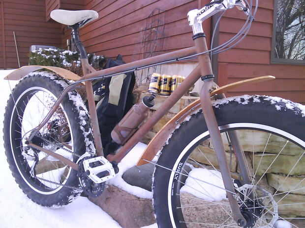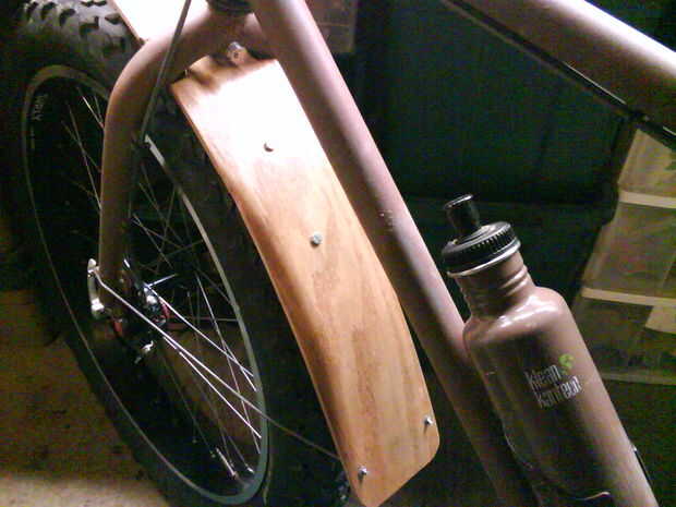 Las defensas se hacen de un 2' x 4' 1/4" madera contrachapada con una chapa del roble en un lado. El hardware es una combinación de portabicicletas trasero y guardabarros y un par largos de 1/8" varilla de acero. El producto final fue acabado con un barniz marino. El proyecto entero me costó $4 para la madera, las piezas de hardware en el cajón de basura en la tienda de bicicletas que trabajo, varilla de acero fue de $3 y usé algún barniz sobrante en mi taller de casa.