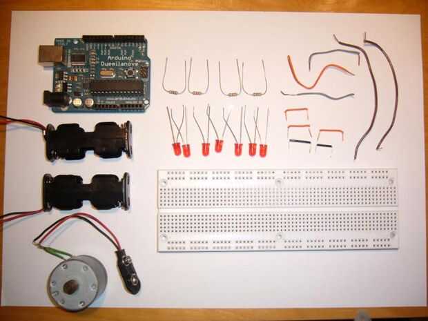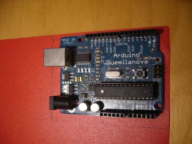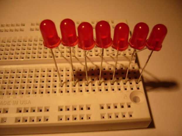 (Usted puede utilizar leds en diferentes colores como lo hice con el caso WOOOSH). Coloque el Arduino cerca del centro de la matriz y montarlo en la matriz. Utilicé hilos simples para eso. Desde la parte inferior de la Arduino tiene algunos conductores - usé un pedazo de lámina de plástico como un aislador de la matriz. Conecte un lado de los leds a la IO de arduino (puertos 1-7, dejando el puerto 0 para el gatillo). Utilice resistencias adecuadas y conecte la otra pierna de los leds a la tierra. Usé el riel inferior de la matriz como un terreno común. He usado resistencias de Ohm 420.