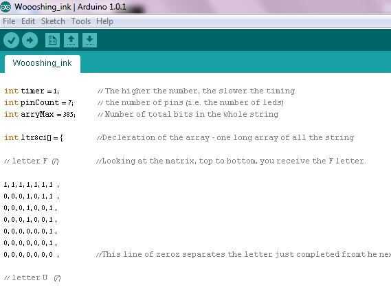 El programa para el Arduino se puede encontrar en el siguiente archivo de texto adjunto (o en la parte inferior del paso). Adjunto ambos programas - el FUFU, la INSTRUCTABLES y lo WOOOSH.   El programa es básicamente un procedimiento que analiza una matriz de unos y ceros y encendiendo y apagando el LED en consecuencia. Cada letra se codifica como una matriz, y encadenar las Matrices (a una matriz de largo) le da todo el texto. Cada columna de la representan matriz uno de los 7 leds montados en fila. Cada fila de la matriz representa el estado momentáneo de todos los 7 leds. Funcionamiento en todas las filas - le da la forma final de la letra / símbolo. En este programa, cada letra tiene "altura" de 7 leds y "ancho" de 7 "micro períodos" (el tiempo de los leds con su estado antes de siguiente la actualización).   Es un poco complicado hacer el prueba y el error de las letras y tipos de letra que desea escribir - pero finalmente usted debe resultados muy agradables. La idea es pensar de cada uno llevó un píxel que se está propagando con el tiempo y girándolo dentro y fuera, se dibuja imágenes a lo largo del círculo en que se ejecute.   A continuación es el texto del programa para el Arduino escribir "instructables".       int contador = 1;                  Cuanto mayor sea el número, menor el tiempo. pinCount int = 7;           el número de pines (es decir, el número de leds) int arryMax = 727;          Número de bits total en toda la cadena int ltr8c1 [] = {//Decleration de la matriz - una matriz de largo de la cadena / / escritura "instructables" / / letra "i" (4) //Looking en la matriz, de arriba hacia abajo, usted recibe la carta de F.   1,1,1,1,1,0,1, 0,0,0,0,0,0,0 0,0,0,0,0,0,0, //This línea de zeroz separa la letra acaba de terminar de la siguiente carta - apagando todos los leds. 0,0,0,0,0,0,0, / letra "n" (8) 1,1,1,1,1,1,1, 0,0,0,0,1,1,0, 0,0,0,0,0,1,1, 0,0,0,0,0,0,1, 0,0,0,0,1,1,0, 1,1,1,1,1,0,0, 0,0,0,0,0,0,0, 0,0,0,0,0,0,0, / letra "s" (9) 0,1,0,0,1,1,0, 1,1,0,0,1,1,0, 1,0,0,1,0,0,1, 1,0,0,1,0,0,1, 1,0,0,1,0,0,1, 1,1,1,0,0,1,0, 0,1,1,0,0,1,0, 0,0,0,0,0,0,0, 0,0,0,0,0,0,0, / letra "t" (9) 0,0,0,0,0,1,0, 0,0,0,0,0,1,0, 0,0,0,0,0,1,0, 0,1,1,1,1,1,1, 1,0,0,0,0,1,0, 1,0,0,0,0,1,0, 0,1,0,0,0,1,0, 0,0,0,0,0,0,0, 0,0,0,0,0,0,0, / letra "r" (9) 1,1,1,1,1,1,1 , 0,0,0,0,1,1,0, 0,0,0,0,0,1,1, 0,0,0,0,0,0,1, 0,0,0,0,0,0,1, 0,0,0,0,0,1,0, 0,0,0,0,1,1,0, 0,0,0,0,0,0,0, 0,0,0,0,0,0,0, / letra "u" (8) 0,1,1,1,1,1,1, 1,1,0,0,0,0,0, 1,0,0,0,0,0,0, 1,0,0,0,0,0,0, 1,1,0,0,0,0,0, 0,1,1,1,1,1,1, 0,0,0,0,0,0,0, 0,0,0,0,0,0,0, / letra "c" (9) 0,0,1,1,1,0,0, 0,1,1,0,1,1,0, 1,1,0,0,0,1,1, 1,0,0,0,0,0,1, 1,0,0,0,0,0,1, 0,1,0,0,0,1,0, 0,1,0,0,0,1,0, 0,0,0,0,0,0,0, 0,0,0,0,0,0,0, / letra "t" (9) 0,0,0,0,0,1,0, 0,0,0,0,0,1,0 , 0,0,0,0,0,1,0, 0,1,1,1,1,1,1, 1,0,0,0,0,1,0, 1,0,0,0,0,1,0, 0,1,0,0,0,1,0, 0,0,0,0,0,0,0, 0,0,0,0,0,0,0, / letra "a" (9) 0,0,1,0,0,1,0, 0,1,0,1,0,0,1, 1,0,0,0,1,0,1, 1,0,0,0,1,0,1, 0,1,0,0,1,0,1, 0,1,1,0,1,0,1, 1,1,1,1,1,1,0, 0,0,0,0,0,0,0, 0,0,0,0,0,0,0, / letra "b" (9) 1,1,1,1,1,1,1, 0,1,0,1,0,0,0, 1,0,0,0,1,0,0, 1,0,0,0,0,1,0, 1,0,0,0,0,1,0, 0,1,0,0,1,0,0, 0,0,1,1,0,0,0, 0,0,0,0,0,0,0, 0,0,0,0,0,0,0, / letra "l" (4) 1,1,1,1,1,1,1, 0,0,0,0,0,0,0, 0,0,0,0,0,0,0 0,0,0,0,0,0,0 / letra "e" (9) 0,0,1,1,1,0,0, 0,1,0,1,0,1,0, 1,0,0,1,0,0,1, 1,0,0,1,0,0,1, 1,0,0,1,0,0,1, 1,0,0,1,0,1,0, 0,0,0,1,1,0,0, 0,0,0,0,0,0,0, 0,0,0,0,0,0,0, / letra "s" (8) 0,1,0,0,1,1,0, 1,1,0,0,1,1,0, 1,0,0,1,0,0,1, 1,0,0,1,0,0,1, 1,0,0,1,0,0,1, 1,1,1,0,0,1,0, 0,1,1,0,0,1,0, 0,0,0,0,0,0,0}; Añadir int = 0; int inPin = 0; int estado = alta; / / el estado actual de la salida del pin int lectura; / / lectura de la corriente de la clavija de entrada int anterior = bajo; / / la lectura anterior desde el tiempo de entrada de pin = 0; / / la última vez que la pin de salida fue alternado safedelay largo = 50; / / un retardo de seguridad para evitar parpadeo debido a multi disparo. void setup() {} / / Programa para escritura de INSTRUCTABLES int thisPin; para (int thisPin = 0; thisPin < pinCount; thisPin ++) {/ / usar un bucle inicializar cada pin como salida. Los elementos de la matriz están numerados del 0 al (pinCount - 1). pinMode (thisPin + 1, salida); } pinMode (inPin, entrada); / / initializesinitializes pin "0" como un pin de entrada - utilizado para el pasador del gatillo. } void loop() {//Here comienza el bucle de la lectura de sequance real = digitalRead(inPin);   Si (leer == alto & & anterior == baja & & millis() - tiempo > safedelay) {/ / comprobar si hubo un disparo. Si sí y el retardo de seguridad del gatillo pasado ha pasado, comienza el sequance.     tiempo = millis();                                                                                                                    Un contador de tiempo (milisegundos) - coults el tiempo de retardo de seguridad.     para (agregar int = 0; agregar < arryMax; agregar = agregar + 7) {//The "añadir" puntos de varible en la fila pertinente - hasta llegar al final de la matriz.       para (int thisPin = 0; thisPin < = pinCount; thisPin ++) {//The varible "este pin" señala en la columna correspondiente si (ltr8c1 [thisPin + Añadir]) {digitalWrite (thisPin + 1, alto);} else {digitalWrite(thisPin+1,LOW);}  Si la celda correspondiente de la matriz es igual a 1, activar el relevalnt conducido. De lo contrario (si es igual a 0)-Apague el led.         } delay(timer);                                                                                                                       Mantener el estado actual por un tiempo.      para (int thisPin = 0; thisPin < = pinCount; thisPin ++) {digitalWrite(thisPin+1,LOW);        }}} anterior = lectura; }