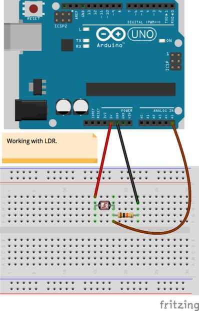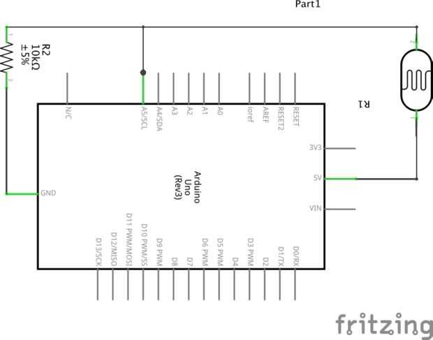 Uno de los terminales de la LDR está conectado a la fuente de 5V de Arduino +. Entonces el otro terminal está conectado con el Resistor R1. El otro extremo de R1 está conectado a la tierra. Desde el punto donde se conectan los dos terminales de LDR y R1; Conecte un cable analógico entrada Pin 5 de Arduino (A5). Eso es que en el hardware. Atención: en el circuito, la entrada a Arduino es una entrada analógica de medición el valor de la tensión en R1.
