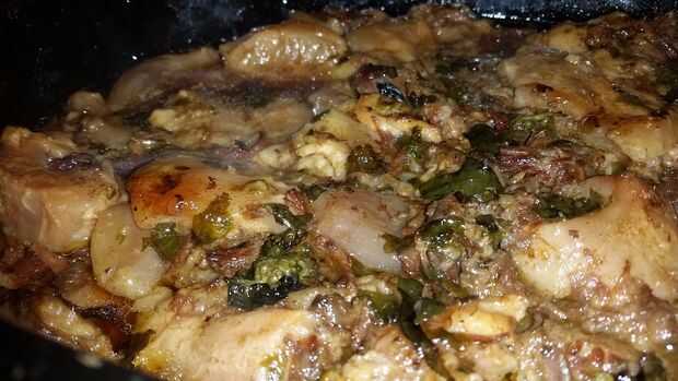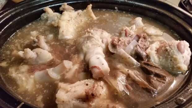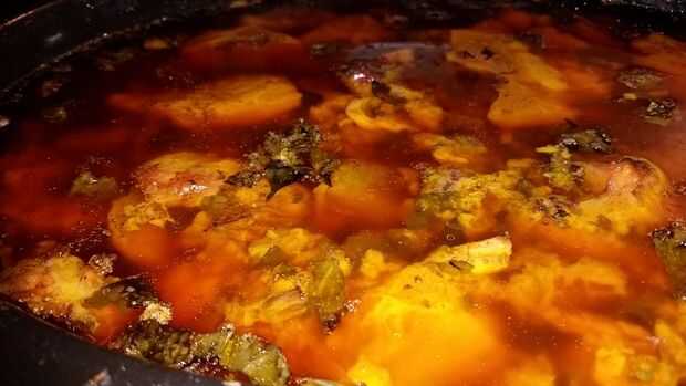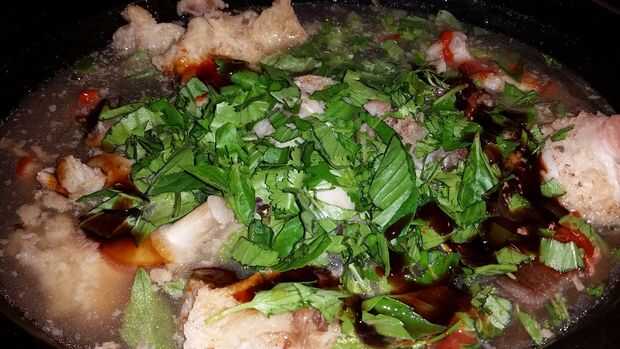 Lanzar el tendón en la vasija olla agregue agua según sea necesario para cubrir la mayor parte de la carne. Agregar cilantro, albahaca y cebolla verde picado. Dejar cocinar por al menos 5 horas y a veces enferma incluso ir hasta 12. Una vez que su hecho cocción debe ser capaz de cortar con los dedos. Descremada de todo el aceite como antes.