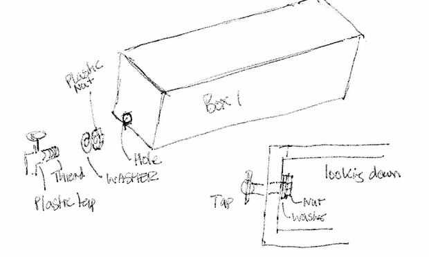 Tomar el primer envase (dibujo 2) y perfore un agujero de aproximadamente 1cm por encima del base interior en el centro de uno de los extremos, para encajar el eje del grifo, atornillar en lugar y coloque la arandela y la tuerca de plástico en el interior y apriete, luego toma los bloques suficientes que el grifo se puede.