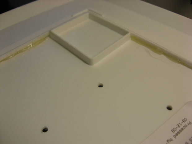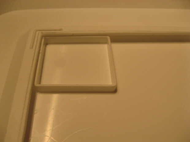 Los pies de la caja deben caber firmemente en el agujero cuadrado que se corta. Si no, algún recorte cuidadoso de la tapa debe arreglarlo.