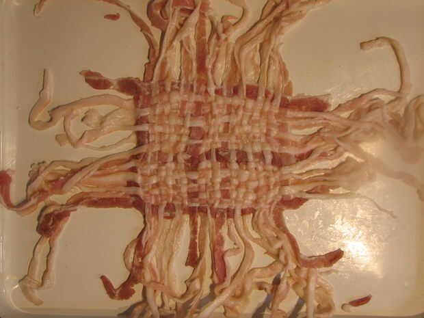Aquí hay un giro en la explosión de Bacon más tradicional!Paso 1: ingredientes2 libras de tocino2 libras de carne molida1 paquete de 8 oz rallado o quesoCondimentos (salsa picante, jalapeños, salsa de barbacoa, etc.)Barbacoa rub/condimentosChips para