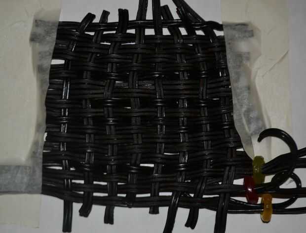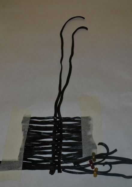 Coloque dos cadenas más largas (que van a ser los cordones de cuello) en medio de las cadenas que se establece antes, pasar debajo de una cadena y encima de la otra, luego en, luego en la tapa, etc., etc... como en un telar.