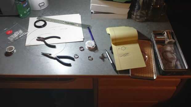 • alambre (mezclado y emparejado de diversos colores y calibres. Colores: oro color de rosa, negro, bronce. Calibres: 20, 24 y 26 indicadores.)