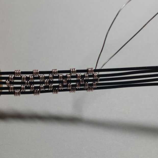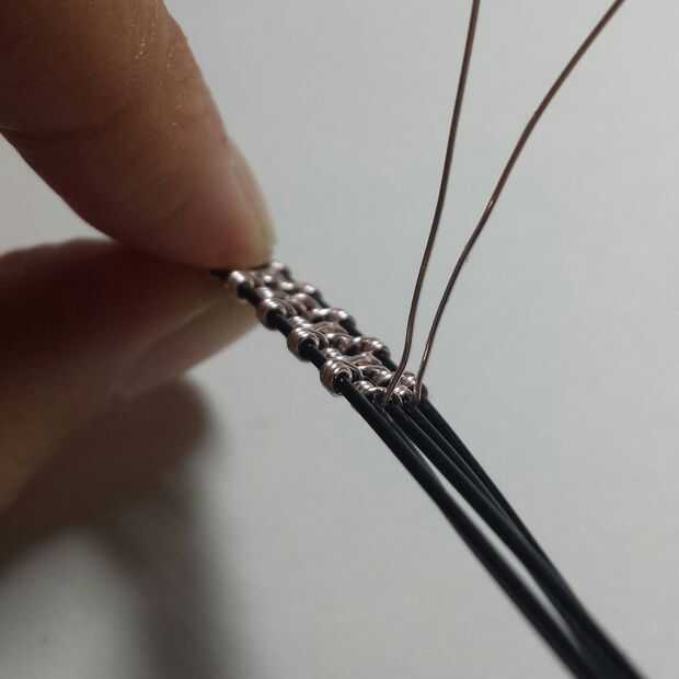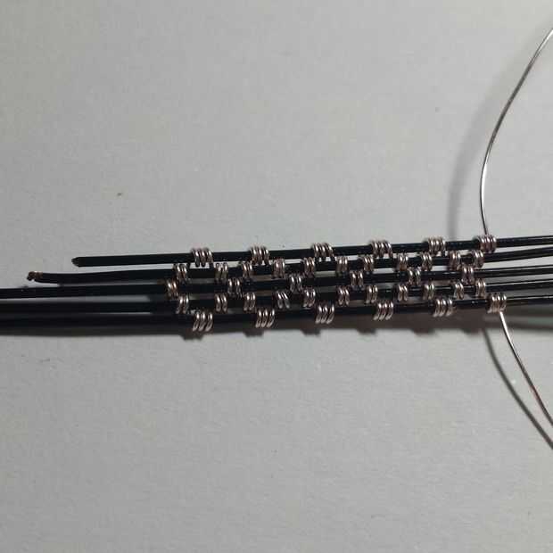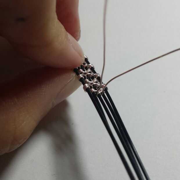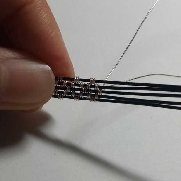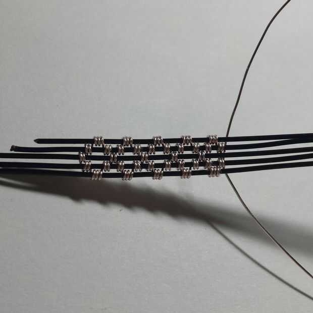 Principales conceptos: a partir de la media y cruzan (la mitad de su alambre fino alrededor del alambre de base mediano de la bobina y cruzar los cables para que no acaben con una maraña)