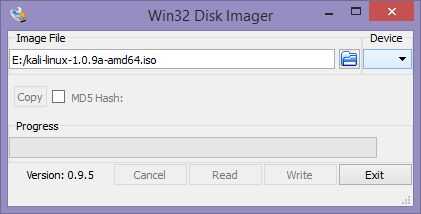 Uso Win32 Disk Imager para seleccionar el archivo ISO de Linux de Kali. Asegúrese de que selecciona la unidad de flash correcta para escribir la imagen. Tenga mucho cuidado con esto, se borrarán jamás unidad que usted seleccione.