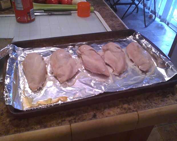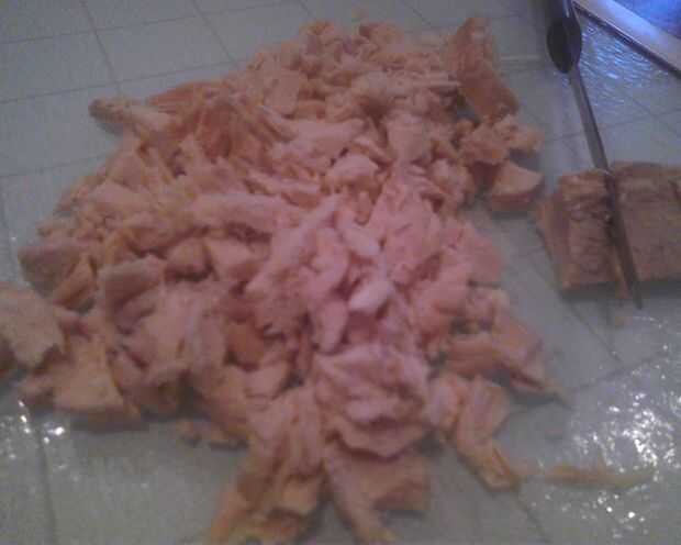 En primer lugar, poner la pechuga de pollo en una bandeja de horno y hornear durante unos 45 a 55 minutos a 350 grados. Cuando el pollo está hecho, sacar del horno y deje enfriar. Luego, desmenuzarlo finamente (o en trozos pequeños). Reservar en un bol mediano.