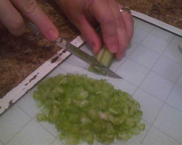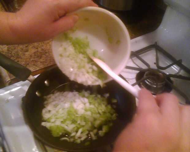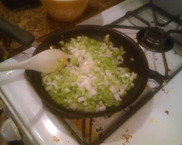 A continuación, trocear finamente el apio y la cebolla. En una sartén pequeña, calor 1 cucharada de aceite de oliva, luego agregue la cebolla y apio. Saltear ' a fuego medio durante unos 10 minutos o hasta que el dulce. Poner en un cuenco y reservar.