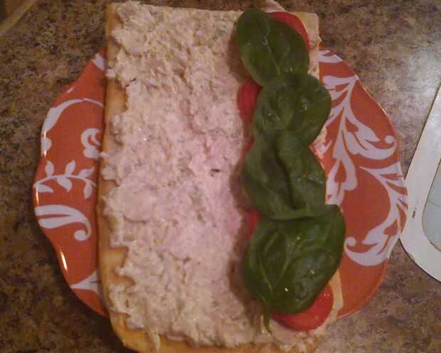 A continuación añadir las rodajas de tomate sobre una mitad va longitud sabio de la envoltura. Luego, coloque las hojas de espinaca encima los tomates.