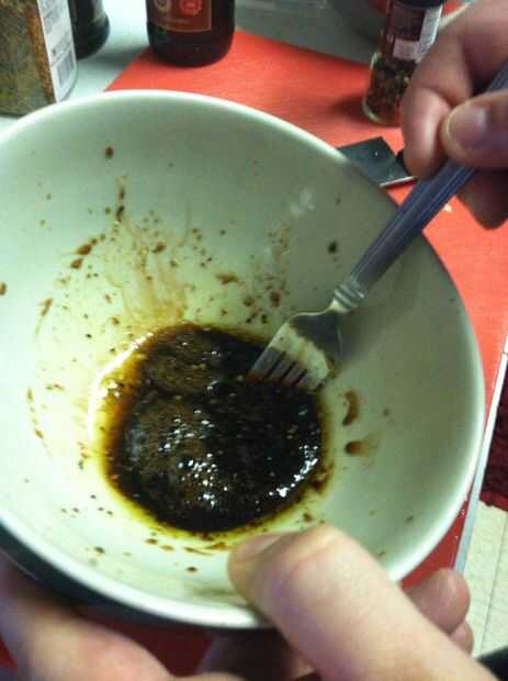 Mezclar la vinagreta con un tenedor bien real.