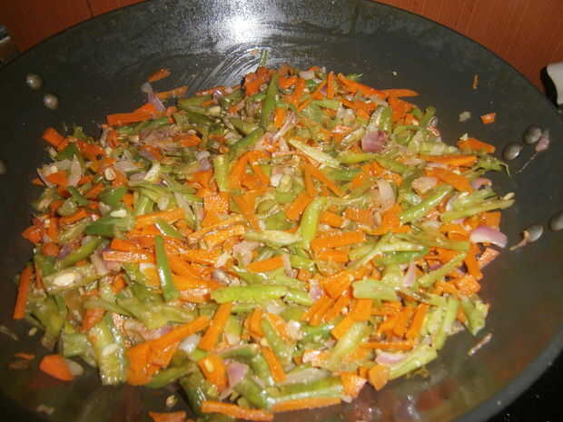 Calentar una cacerola y vierta el aceite. Cuando el aceite esté caliente añadir el ajo picado y saltear lo. Cuando se infunde el sabor de ajo en aceite, deseche el ajo. Tomate de cebolla rehogar un rato y añadir las verduras y cocinar hasta suave.