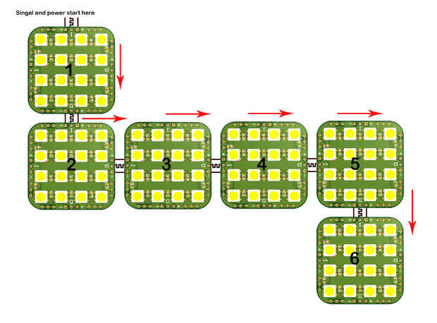 Como señal de cada unidad LED de la matriz son serial conectado y controlado por el protocolo de una línea, puede tratar la Junta de unidad como una gran luz de LED, sólo asegúrese de que todas las unidades siguen la regla de entrada/salida, entonces usted puede fácilmente controlar todas las unidades y todas las luces de LED únicas en toda la estructura. Para fijar las unidades, soldar con cabeceras macho 2.54 m m, por supuesto, puede utilizar otros métodos. Hay ocho agujeros de 2.5mm de 1x3pin de tierra, usted puede soldar libremente para la construcción de propósito. Para la estructura general propósito de conexión, puede soldar encabezados femeninos o masculinos encabezados. Sin embargo, debe soldar macho encabezado en estos puertos para propósito de construcción.