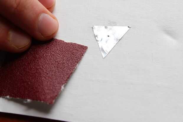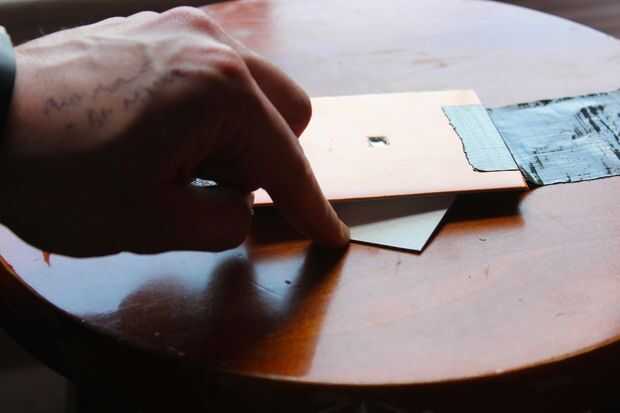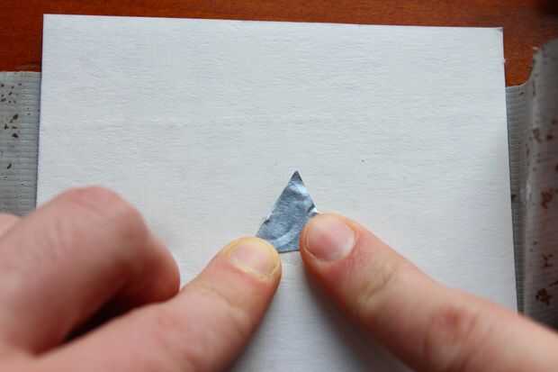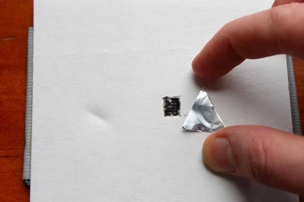 6) con cuidado coloque su pequeño pedazo de aluminio sobre la abertura y presione con los dedos. (el aluminio debe ser más gruesa que el papel - puede utilizar una tapa de la botella o la cáscara de una vela votiva como lo hice para este agujero de alfiler)