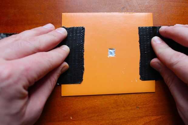 1) cortar un aproximadamente 2 x 2 en cartulina cuadrado hacia fuera con tijeras o cuchilla de utilidad esta dos no tiene que ser perfecto pero necesita ser lo suficientemente grande como para cubrir completamente la lente (puede comprobar el tamaño colocando el cuadrado sobre la lente tapada para ver)