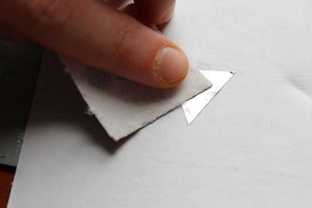 7) Tapa cartón con aluminio adherido sobre para que el aluminio está haciendo directo contacto con su superficie de corte, esto proporcionará una superficie más al ras para pinchar (Deslice el otro trozo de cartón debajo de la hoja si es necesario proteger tu superficie de trabajo de los orificios de punción)