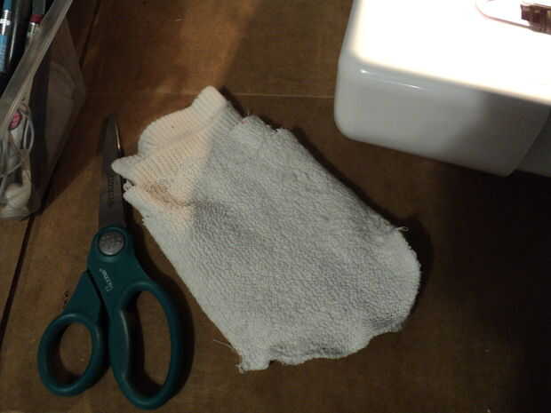Cortadas y alrededor de la porción de puño del calcetín por coser con el calcetín volteado adentro hacia fuera. Al girar atrás hacia fuera, la costura terminada será lisa. Cortar secciones del calcetín restante para cubrir y bulto encima de la sección de cosido para que no tenga que rellenar más adelante.