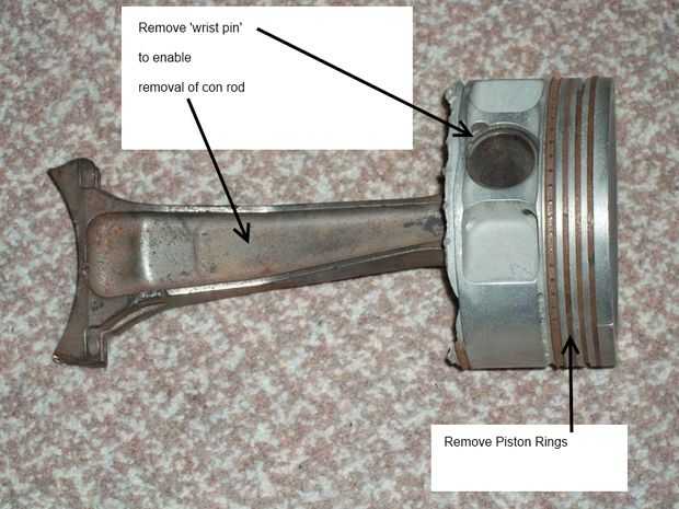 Dependiendo de su pistón, puede necesitar una prensa hidráulica para eliminar el conexión 'pasador' entre la cabeza del pistón y la biela o podría ser unos anillos elásticos en un hueco.