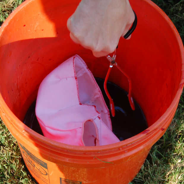 Me decidí a teñir la máscara (y bastante tela blanca para hacer la necesaria de la chaqueta de rayas y pulseras para el tobillo de arranque), por lo que sería menos lío. Sin embargo, descubrí que temperatura muere no produce colores tan intensos como fuegos moribundos.