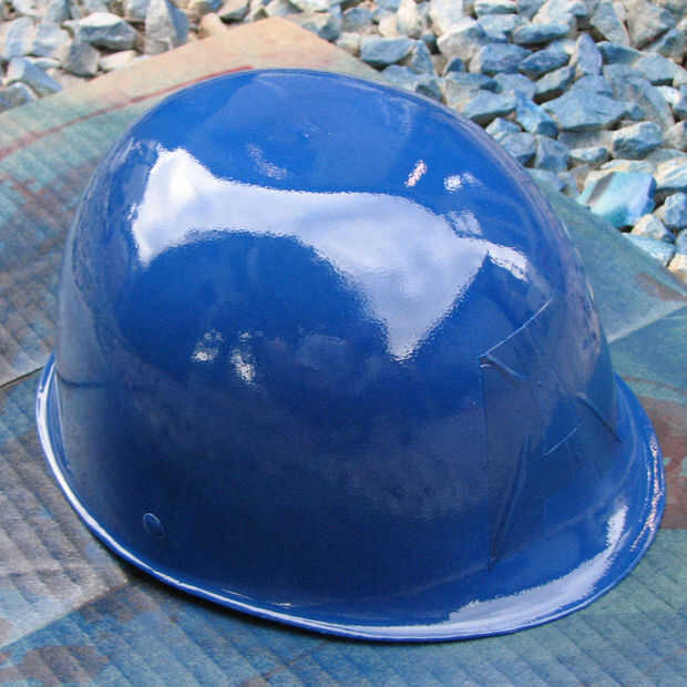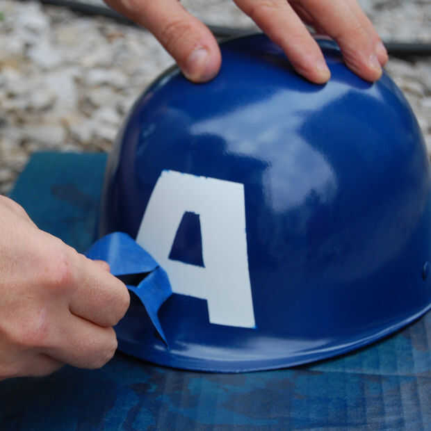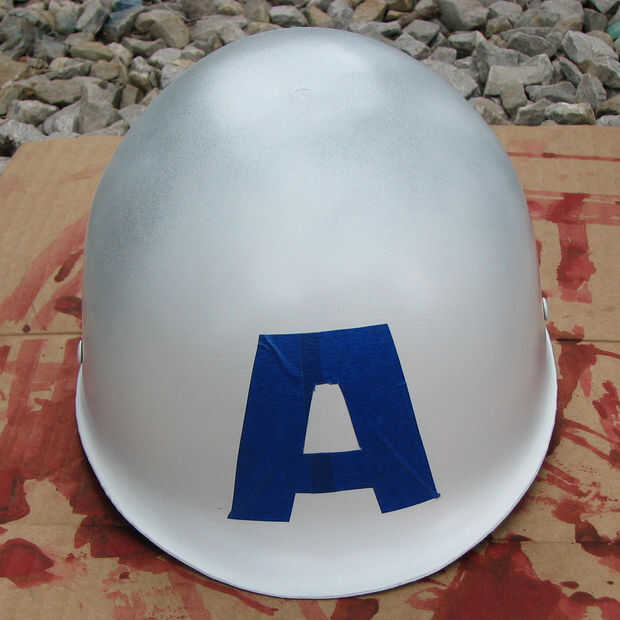 Apliqué la pegatina al casco pintado, enmascaramiento de donde sería el blanco "A". Entonces, aerosol-pintado el resto del casco azul. Incluso pinté la parte inferior del casco, así (haciendo seguro que cubre la correa del casco con cinta previamente).