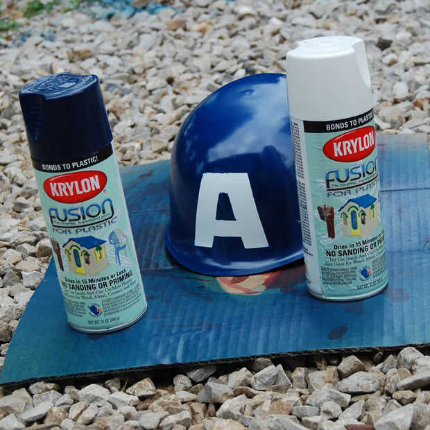 Para hacer la máscara, empecé por pintar el frente del casco del ejército de juguete blanco. Usé pintura de fusión de Krylon porque supuestamente adhiere al plástico mejor que la típica pintura de aerosol.