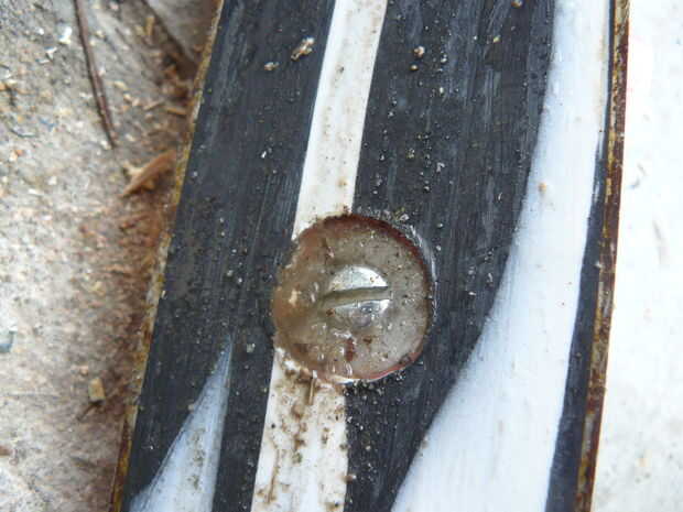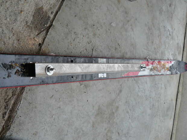 corté los esquíes a unos 110cm de largo al igual que los de Burley (guardan las espaldas de los esquís para algo, no sé qué todavía). Luego de 3" de la parte trasera que sujeta una pieza de tubo cuadrado centrado en el esquí de izquierda a derecha. Para ello, perforé a través del tubo y la parte inferior de la estación de esquí. Luego volcó el esquí y contador hundido un agujero con la pala de bits para aceptar el perno y la arandela---que te rellene esto más adelante. A través de la parte inferior de la estación de esquí inserta el perno con la arandela a través del tubo y apretado.