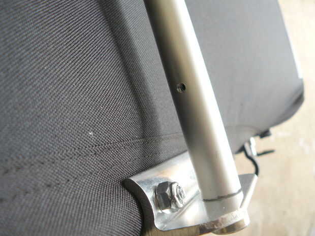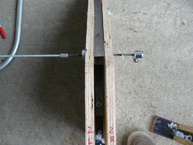 Luego, medí la distancia entre piezas de exterior de madera montado en la silla de paseo menos que la longitud del lanzamiento rápido y cortar la varilla roscada para ajustar. I inserta el lanzamiento rápido con una arandela de defensa a través del soporte y había conectado a la varilla roscada con los acopladores de barra a cada lado e inserta en el tubo transversal de la silla de paseo (tuve que bang 1 pasador a cada lado que esto mantiene en su lugar). En el otro lado, he insertado el lanzamiento rápido con otra arandela a través del soporte y atados a la barra de acoplamiento en el tubo transversal. Creo que cambiaré esta varilla roscada de 1/4" y tuercas de mariposa, a veces es difícil alinear la liberación rápida y acoplamiento.