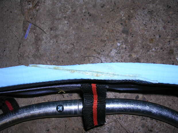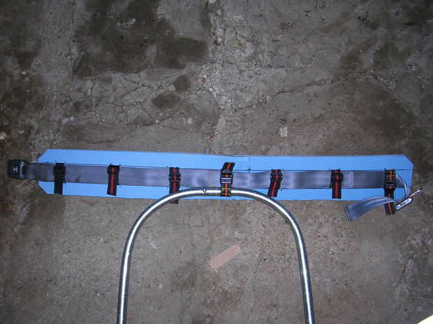 OK, ahora ¿cómo fijar el cinturón de seguridad a la espuma para el relleno se queda debajo de la correa? Decidí hacer unas ranuras en la espuma y me Inserte la correa de nylon ancho de 1" a través de las ranuras y hebilla en el cinturón de seguridad. Esto permitiría que el cinturón se deslice con respecto a la espuma cuando se ajusta para diferentes cinturas la hebilla estará en el frente y el relleno aún puede estar centrado. Cortar las cintas de 1"(dejando un montón) y me cosió en las hebillas en los lugares apropiados. Acabo de hacer una puntada recta a través de éstos como que realmente no se sostiene mucho.