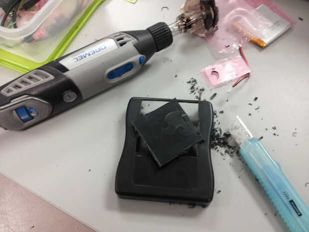 Para este prototipo utiliza un caso existente en el mercado y corte una ventana para que esa matriz de LED podría sobresalir. Utilicé una herramienta Dremel para cortar el plástico. Usé un taladro normal para cortar dos agujeros pequeños para que puedo colgar el cuadro prototipo debajo de la nuca. La foto está tomada después de la sesión de corte. El vídeo muestra en acción. ¿Está divertido agregar alguna acción con las herramientas, derecha?