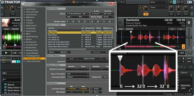 Los pasos de configuración a continuación son para el software de Traktor DJ (http://www.native-instruments.com/#/en/products/dj/traktor/). Otro software podría requerir configuraciones diferentes, o puede no proporcionar dicha información fase beat sobre canales MIDI.