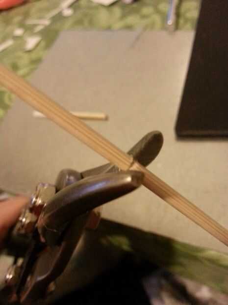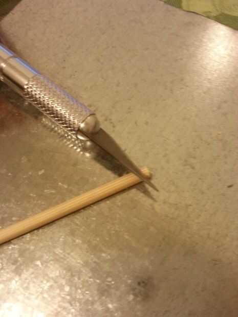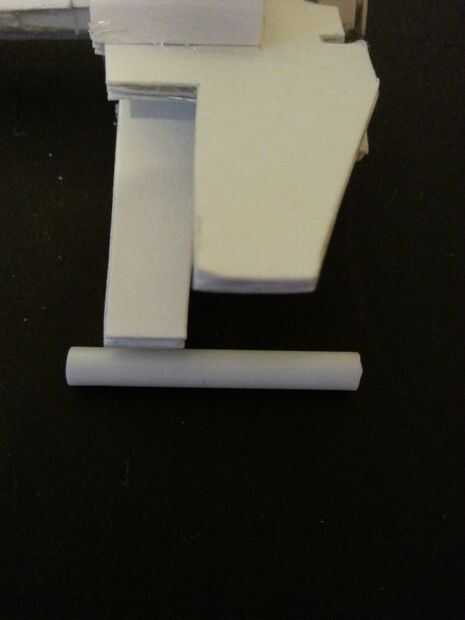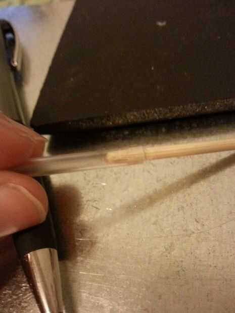 Usando las barras de plástico de los bits de portaminas antes cortadas 4 de estos a la longitud deseada (cortarlas para colgar un poco detrás y delante de la punta del ala). Luego haz unos pinchos (punta) y poner un pegote de pegamento caliente en el punto y deslice en la barra de plástico. Si no tiene ningún sentido agudo simplemente corte un punto con su cuchillo del Exacto. Una vez asegurado, alinee sus blasters y recortar a la longitud deseada. Recortado a mentir un poco delante de la cabina.
