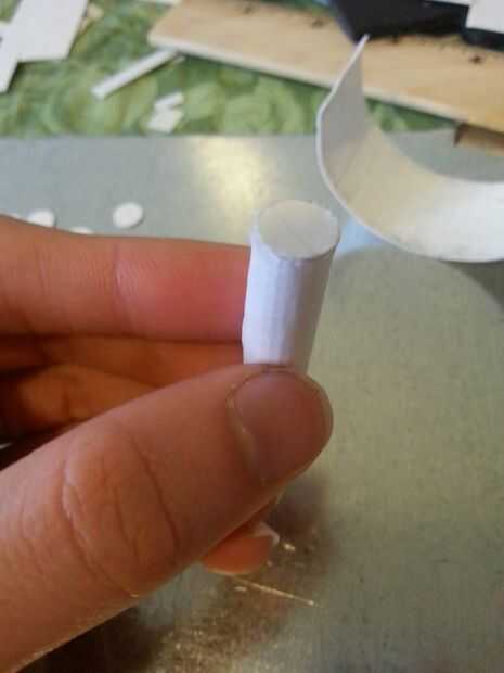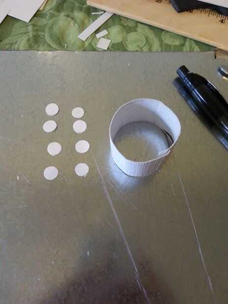 Corte cuatro círculos pequeños (intenté conseguir sus diámetros para que coincida con el radio de los círculos de la mitad) y un rectángulo. Terminé usando sólo cuatro en lugar de ocho en el cuadro porque tenía el componente de motor en la parte posterior. Usando el círculo, enrolle el rectángulo segmentado y corte para caber un cilindro con el mismo diámetro que el círculo pequeño y luego utilizar una tira de cartulina y pegamento caliente para mantener la forma cilíndrica.