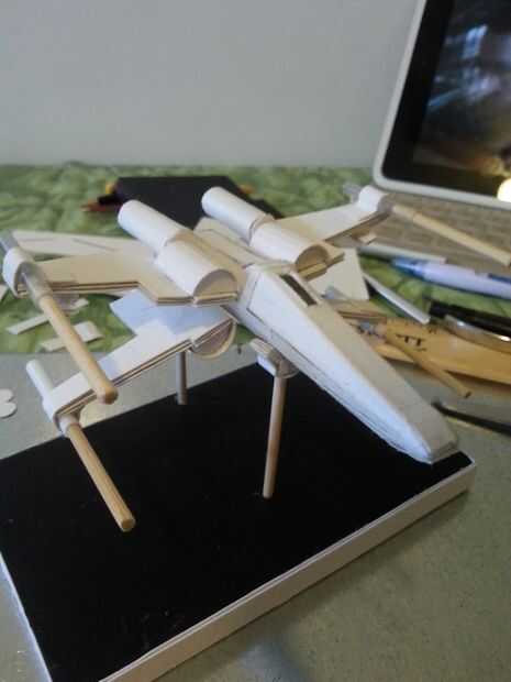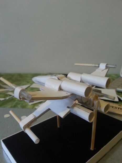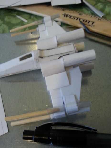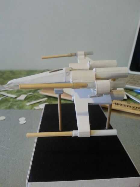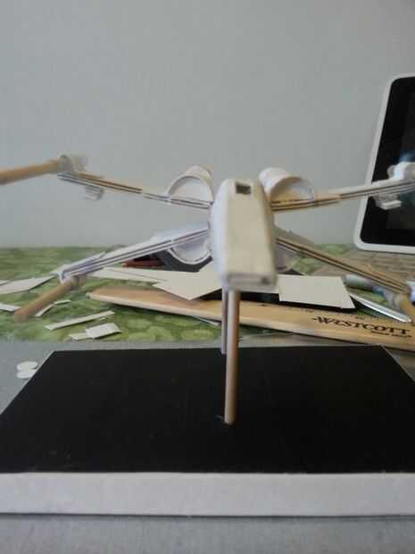 O simplemente poner una pantalla... Quiero decir que ambos son bastante buenos. de todos modos, este paso no tiene muchas fotos porque me precipité a través de esta parte pero básicamente estándar pantalla bases están fabricadas con el negra tablero (cartulina superior e inferior con espuma adentro) de la espuma para añadir estabilidad y rodeado de cartulina para completar el look de la caja. He usado pinchos poked y pegado en el tablero de la espuma junto con una \__ / pieza para la nariz delantera de x-wing y una L para el back-end.