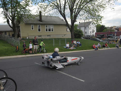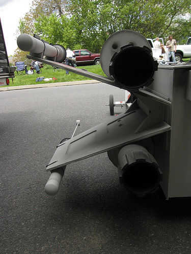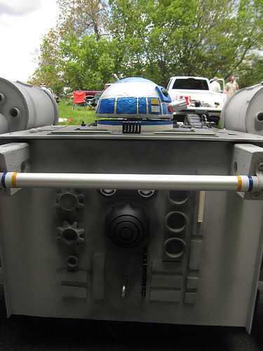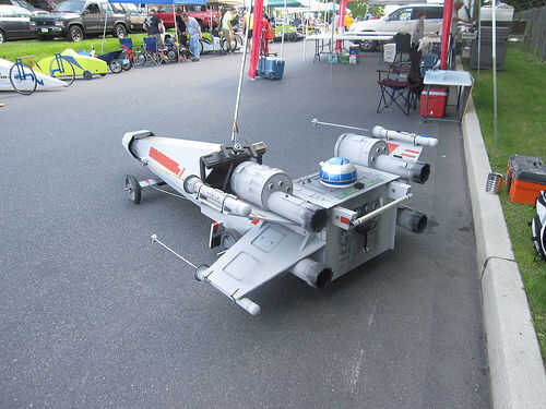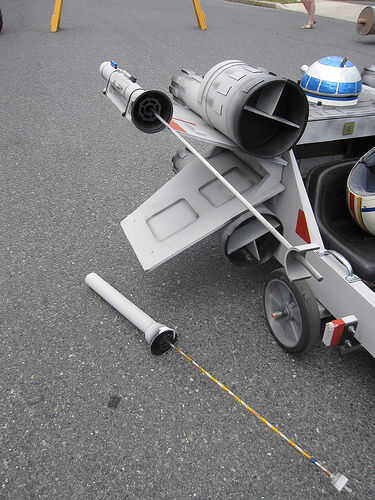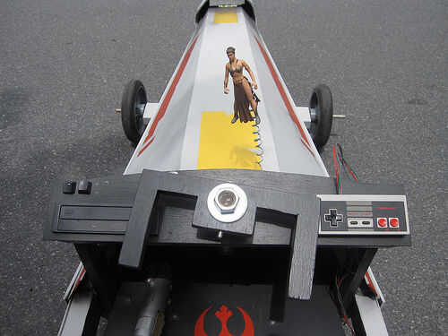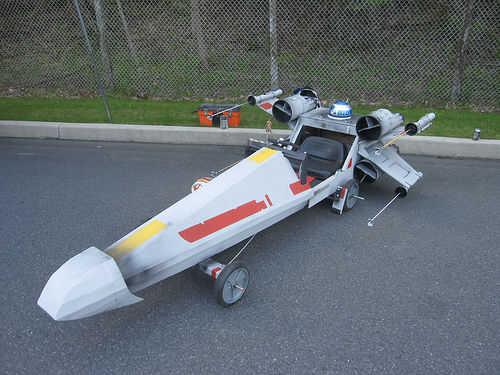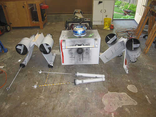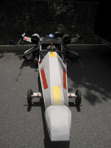 R2-D69: El droide de spinning fue construido de espuma de poliestireno y pintado para parecerse a R2-D2. Uno de los juguetes de mi hija utilicé para crear el movimiento. El juguete tenía un engranaje en que girar cuando se presiona un botón. Corté el juguete por la mitad (era demasiado grande) y montar el juguete en la parte inferior del cuerpo y pegado a la cabeza del droide en el engranaje. Para controlar el giro utilicé un viejo controlador NES. Vuelve a encaminar interruptor del juguete a través del controlador de la NES por lo que cuando se presiona los botones A o B el droide girar durante unos 15 segundos. Para el audio, he descargado algunos efectos de sonido de R2-D2 de un sitio web y utiliza el software Pinnacle movie studio para cadena todos juntos en un segundo 50 balbuceo droide Mp3. Me carga esto en un iPod y había conectado a un sistema de altavoces portátil pequeño que me escondí dentro del cuerpo del coche. Esta manera, cada vez que me puse abajo de la colina, pude presiono el botón del regulador NES y el botón de play del iPod a la paranoia del droide. Las alas fueron otra parte delicada. Hice dos juegos de soportes que sostendrían las alas en la correcta forma de X y se podían montar a los lados del coche. Algunas tuberías de drenaje se utilizan para las cosas de "motor".