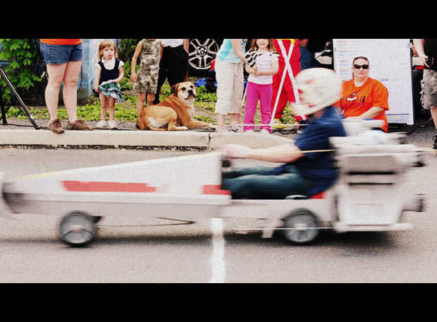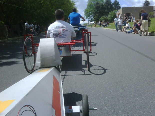 rotura de la o. En la inspección post mortem del coche al día siguiente noté que también se agrietó la silla del eje. Supongo que esto ocurrió al mismo tiempo como el daño de cojín de descanso. Tirando de la palanca de freno demasiado duro debe haber empujado la rueda (y el eje) demasiado la espalda, que derramó la silla del eje. También, durante mi segundo calor (soporte del perdedor de la primera ronda) colisionaron y se enredó con otro coche que fue formada como una cámara. Drásticamente, todavía manejado ganar que el calor y pasar a la siguiente ronda.