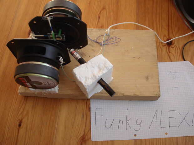 Las vibraciones de los altavoces base 2 (con 1 espejo cada orador) hace que el rayo láser se mueven con la música y las frecuencias (audio).