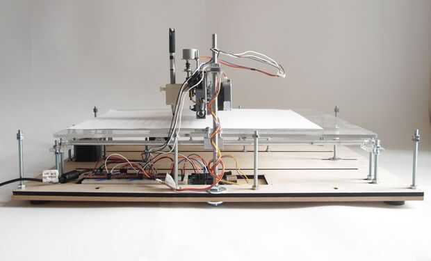 El plotter está compuesto por 3 motores paso a paso que cada uno alimentado por un EasyDriver V4.4 y escurr una fuente de CC de 12V. Puesto que los tres ejes apuntan a un motor paso a paso la pluma podría reemplazarse con un router y se convierten en una máquina CNC de fresado (en teoría).