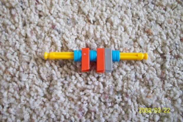 Esta es el verdadera arma de K'nex más pequeño. Y NO UN BLOQUE! ¿Awesome, derecho? No es sólo el más pequeño, pero utiliza menos piezas. 3 piezas para hacerlo. Una cosa naranja (no sé lo que se llaman) y 2 espaciadores azul (uno por disparo, uno para