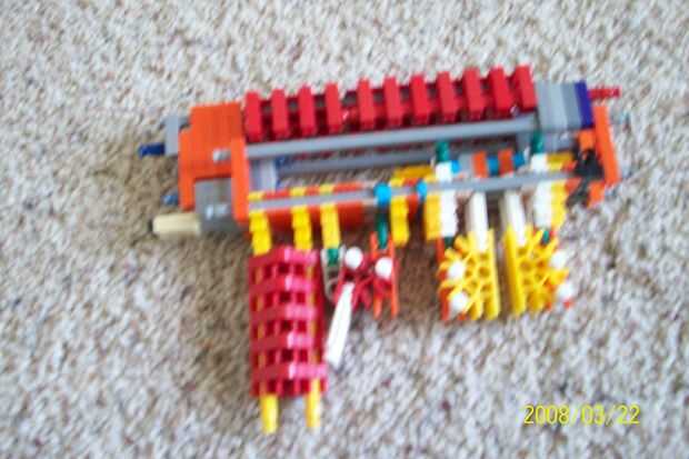 Esta es el verdadera arma de K'nex más pequeño. Y NO UN BLOQUE! ¿Awesome, derecho? No es sólo el más pequeño, pero utiliza menos piezas. 3 piezas para hacerlo. Una cosa naranja (no sé lo que se llaman) y 2 espaciadores azul (uno por disparo, uno para