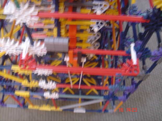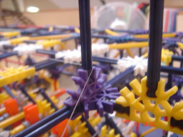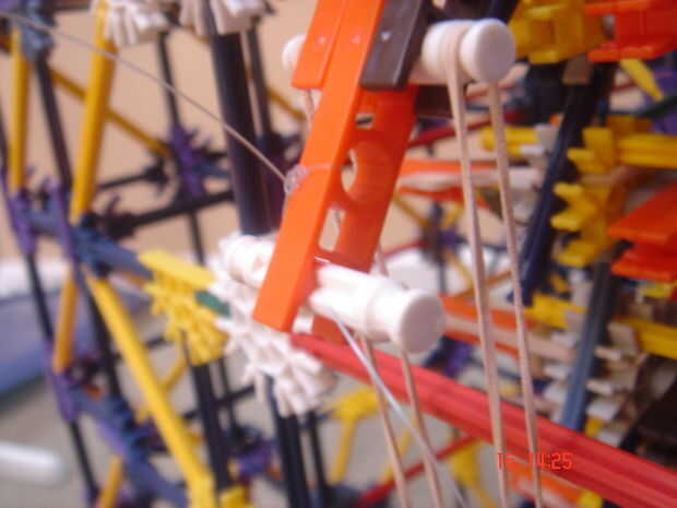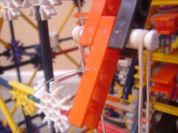 De todos modos, atarla alrededor de la pieza naranja un par de veces. Añadir a continuación la parte roja. Luego atar alrededor del borde y añadir una barra blanca. Luego lazo en la parte superior y tire de ella hasta el fondo.